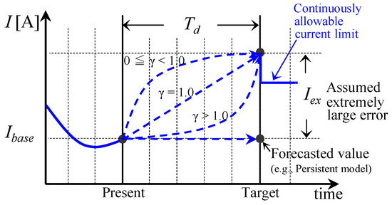 In Equation (3), γ is the most important parameter and represents the severity of the curve, as shown in Figure 2. Further, Td, Ibase, and Iex are the forecasting lead-time for a control action, the forecasted current value, and the assumed large forecasting error in Figure 2, respectively. These three values are exogenous parameters in this analysis. Ibase and Iex are determined using a forecasting method that is usually based on a persistent model for very short-term predictions (e.g., within 30 min) for renewable energy generation. Td is the time interval between the present time and the target time in Figure 2 and corresponds to the interval from 0 to 30 min in Figure 1.