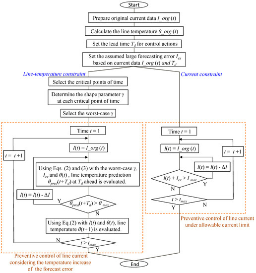 A flowchart is shown in Figure 3 for evaluating the benefits of DLR using the proposed model. This figure shows the procedure for evaluating the temperature-based transmission capacity constraints using the proposed model for forecasting errors in the IRES output while comparing it with the conventional current-based transmission capacity. Before starting the simulation, the line current I_org(t) and the corresponding line temperature θ_org(t) are calculated in advance based on Equation (2). Next, the lead-time Td for the control action and the forecasting error in the current I_org(t), which is determined using a forecasting method, at the time interval Td are calculated. The persistent method, which is used in the simulation that follows, is one of most effective forecasting methods for very short-term intervals (30 min or less).