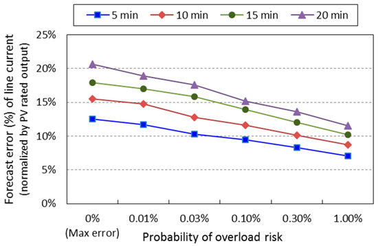 When using the line current variation model shown in Figure 2, the assumed forecasting error Iex at the target time interval Td can be considered an exogenous parameter. In this paper, by adopting the persistent model, the forecasting error for the transmission line current for four different lead-times (5 min, 10 min, 15 min, and 20 min) for a fast demand response was evaluated from an annual viewpoint. Based on the annual forecasting error data for the four different lead-times, the overload risk of Iex was evaluated as shown in Figure 5. As stated at the simulation condition (Section 4.1, assuming that load current between the sending area and the receiving area was constant, line current forecasting error was normalized by PV rated capacity as shown in the figure.