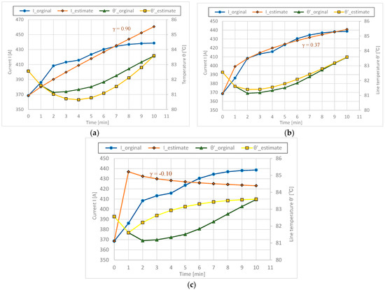 The value of γ is negative in the worst case where the probability (risk) is the highest (1.0%). In order to illustrate this case, while focusing on the case corresponding to a lead-time Td of 10 min, a few examples with different probabilities (0.01%, 0.10%, and 1.00%) are shown in Figure 6. In Figure 6a, it is assumed that the forecasting error Iex at the target time is larger than the actual error. Therefore, in order to fit the estimated line temperature to the actual one, the appropriate γ value was determined and found to be 0.90. Further, in the case of a probability of 0.10%, Iex was smaller than 0.01%. Therefore, the appropriate γ was determined to be 0.37. Consequently, the current variation, as estimated using the proposed model, was close to the actual variation in the current. However, for a probability of 1.0%, the value of γ was slightly negative (−0.10) in order to fit to the actual line temperature at a subsequent 10-min interval because the Iex value was too small.