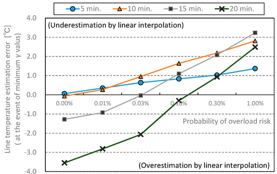 A simple linear interpolation of line current variation between line current at the existing time and at the forecasted time can help to comparatively understand the proposed line current variation model. Figure 7 shows the line temperature estimation error obtained using a simple linear interpolation (γ = 1) in the event of the respective minimum γ value in Table 2. In the figure, a positive error in line temperature implies an underestimation by linear interpolation, while a negative error indicates overestimation by linear interpolation. In Table 2, minimum γ values range from approximately 0.0 to 1.0 in the cases of 5 min and 10 min, respectively. Consequently, in Figure 7, an occurrence of underestimation by simple linear interpolation is shown. Furthermore, the estimation error for the 10 min case was larger than that for the 5-min case because the temperature estimation error was accumulated for the lead-time. In the cases of lead-times of 15 min and 20 min, the minimum γ values ranged from 1.42 to −0.08 and from 2.22 to 0.53, respectively (see Table 2). Consequently, in Figure 7, both overestimations and underestimations occur. Furthermore, similar to the 5-min and 10-min cases, the estimation error width of the 20-min case was larger than that of the 15-min case because the temperature estimation error accumulated. Considering the maximum allowable temperature limit (90 °C), those estimation errors are significant.