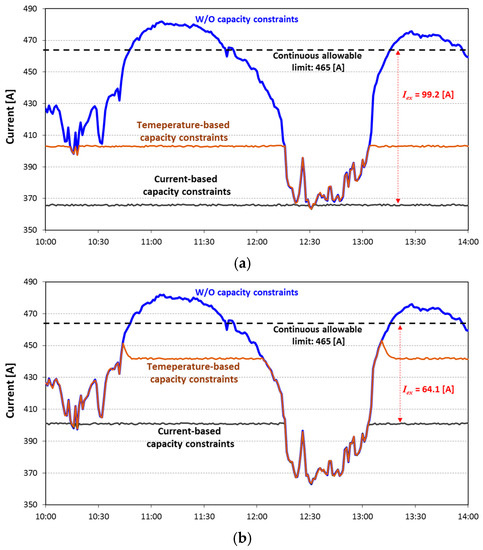 This section explains the effects of the temperature-based transmission capacity constraints for a sample day. As a simulation condition, this focused on 15-min-ahead and 5-min-ahead forecasts at the 0.03% risk level, as shown in Figure 8a,b, respectively. In case of the forecast for 15 min, according to Figure 5, Iex was comparatively larger (99.2 (A) corresponds to 15.9% PVrated). Therefore, in Figure 9a, the conventional current-based transmission capacity poses a lower line current limit. However, in the case of the temperature-based transmission capacity, although the same forecasting error (99.2 (A): 15.9% PVrated) was assumed, the line current changed slowly because the worst-case value of γ was 1.012. This led to a slow increase in the line conductor temperature. Consequently, the line current limit, which can be flown through the sub-transmission line from a preventive control perspective, was higher compared to the conventional current-based capacity constraints.