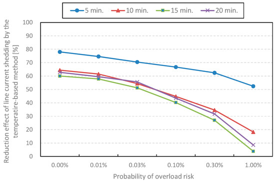 The simulation results are shown in Figure 9. For all lead-times, as the assumed risk level for overload decreased, the benefit of using the temperature-based transmission capacity instead of the conventional current-based transmission capacity became larger because the shape parameter γ increased. Conversely, as the assumed risk level for overload increased, the benefit of the temperature-based capacity decreased. Specifically, in this case, the temperature-based transmission capacity was almost same as the conventional current-based transmission capacity.