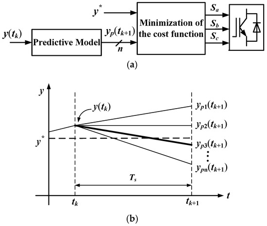 In MPC, a system model is used to predict the behavior of the variables over a certain time horizon, and a cost function as the criterion is used to select the optimal switching states [11]. The principle of this control scheme is illustrated in Figure 2a. All the possible system transitions yp(tk+1) can be predicted using the measured value y(tk) at the control actions according to a prediction model {y(tk), N}. This prediction model is directly derived from the discrete-time model of the system, and it is various depending on the control objectives. Take N = 1 as an example, the system behavior at k + 1 instant can be predicted with the measured value y(tk) and n possible voltage vectors, resulting in n possible values yp1, yp2, …, ypn, as depicted in Figure 2b.