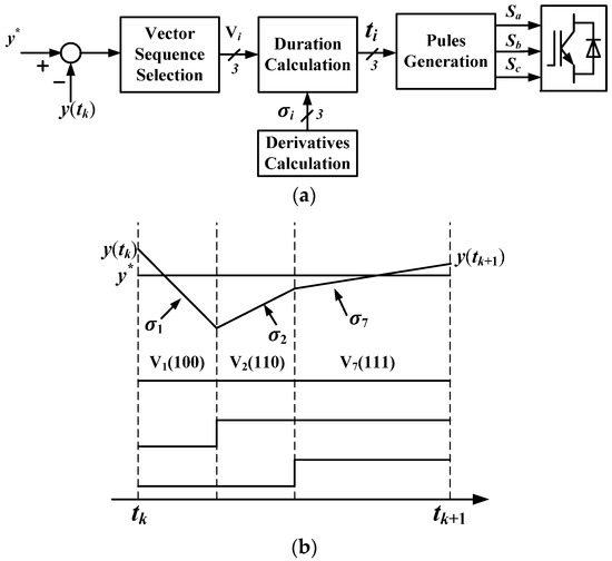 Illustration of MPC operation, (a) block diagram of MPC; (b) vectors evaluation and selection.