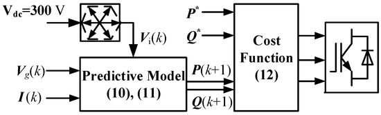 Now the predictive model has been obtained mathematically with Equations (10) and (11). Figure 6 depicts the block diagram of the proposed MPC strategy for grid-connected PV systems. After the power is predicted, the next step is to evaluate the effects of each voltage vector on active and reactive powers and then select the one producing the least power ripple according to a specific cost function. Here, the cost function is defined as follows considering the same weighting priority for P and Q: