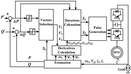 - Hu, J.; Zhu, J.; Zhang, Y.; Platt, G.; Ma, Q.; Dorrell, D.G. Predictive direct virtual torque and power control of doubly fed induction generators for fast and smooth grid synchronization and flexible power regulation. IEEE Trans. Power Electron. 2008, 28, 3182–3194. [Google Scholar] [CrossRef]