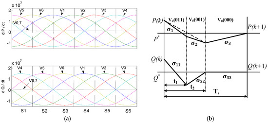 According to Equations (19) and (20), the power derivatives against rotor flux position in steady state for a DFIG wind generator can be obtained, as graphically depicted in Figure 8a. Now let us perform an analysis of the power derivatives. For instance, assuming that the rotor flux is located at the sector S3 while the active and reactive powers are both greater than the referenced values: V4 produces negative active power derivative (or “slope”) and negative reactive power slope; V5 produces negative active power slope and positive reactive power slope; while the null vectors (V0 and V7) generates very small power slopes. Based on this analysis, if the vector sequence V4–V5–V0 is applied, the active and reactive power can be well controlled, which is well illustrated in Figure 8b. In this way, the first two active vectors are used to correct the power errors, while the presence of the null vector is very useful at steady state because it produces relatively small power variation, resulting in the reduction of power ripples.