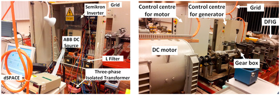 The experimental test has been carried out in a laboratory renewable energy test platform, as shown in Figure 9. In the wind system, a DC motor is used to simulate the wind turbine, which is connected to a 20 kW DFIG via a gear box. In the 10 kW PV system, an Asea Brown Boveri (ABB) DC source with 300 V DC output is use to simulate the PV panel output. The system parameters are listed in Table A1 in the Appendix A. Two dSPACE DS1104 PPC/DSP control boards (dSPACE GmbH, Paderborn, Germany) are employed to implement the real-time algorithm using C language for converter control. The system variables such as voltage, current and rotor position are sampled using the Control Desk. Since the conventional switching table based direct power control (SDPC) developed by Noguchi et al. [29] is a widely employed and accepted control strategy in the scientific community, it is used here as a benchmark reference for all the tests in the paper.