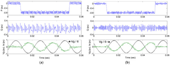 To evaluate the dynamic response of the proposed controller, the active power reference steps down from 0 pu to −0.8 pu and then steps up to 0 pu, while the reactive power reference is kept constant at zero. It is noted that the negative active power indicates that the PV system is feeding energy back to the utility grid. In other words, the current is flowing from the inverter to the grid side. Figure 10 shows the system dynamic response. It can be seen that the active powers are able to drop down to −0.8 pu at 0.01 s in a fast manner by using both SDPC scheme and the proposed MPC scheme. When the active power reference steps up to 0 pu at 0.05 s, it can be observed that the proposed MPC method can reach the new state slightly faster than conventional SDPC scheme, presenting excellent tracking ability. The main difference between two methods goes to the steady-state performance. It can be seen that the proposed MPC scheme results in less active and reactive power ripples in steady state.