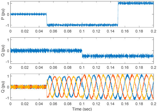 In this test, the PV output is simulated by a DC voltage generated by an ABB rectifier. The proposed MPC scheme is implemented in the grid-connected inverter. The control objectives are the inverter output active and reactive powers, i.e., the power flows between the PV system and the grid. The parameters of the 10 kW PV system are shown in Table A2 in the Appendix A. The results in this test are presented using Per Unit. The powers supplied from the PV system to the grid and the inverter output currents are measured.