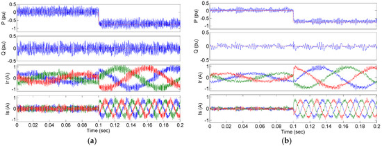The experimental results are shown in Figure 12. From top to bottom, the waveforms are active power, reactive power, rotor currents, and stator currents, respectively. It can be seen that the active power using proposed VPC method can tracking the reference tightly and fast as well as SDPC approach. Besides, no dangerous overshoot currents in the rotor and the stator are observed during transient. It is noted that, due to the application of the proper vectors sequence at each sampling period, the power ripples using the proposed VPC strategy are reduced considerably, leading to an overall improvement of stator and rotor currents.