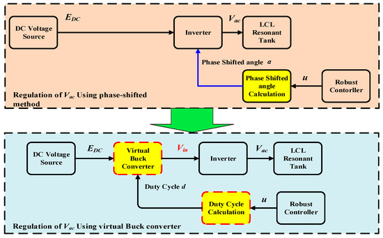 The upper one in Figure 3 is the phase-shifted method. The lower one is its equivalent regulation method using a virtual buck converter. In the real system, the inverter is controlled by a phase-shifted angle α to produce the required Vac, but it cannot be directly used for robust control as an adjustable DC input is required. In this paper, the regulation of Vac using phase-shifted regulation is mapped to an equivalent regulation of Vac using a virtual buck converter. As a result, a virtual adjustable DC input Vin can be obtained for robust controller design.