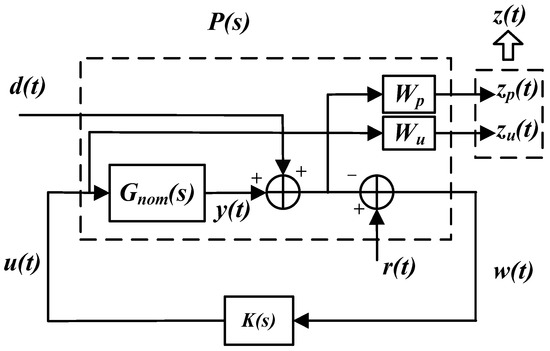 In order to realize multi-objective control, it is necessary to set a cost function to take into account the performance requirements including reference tracking, anti-perturbation and control energy limitation. Based on these requirements, the system structure can be established by using mixed sensitivity optimization design, which is shown in Figure 7.