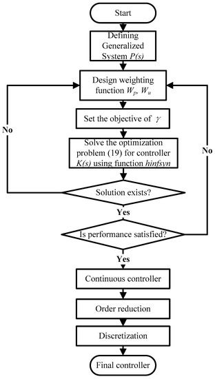 After uncertainty modeling and weighting functions selection, the suboptimal H∞ controller design can be realized with aid of the Robust Control Toolbox of MATLAB. Based on the generalized plant model P(s), the robust controller K(s) can be directly obtained using the hinfsyn function. The form of function call is hinfsyn (P, nmeas, ncon, gmin, gmax, tol), where P denotes P(s) model, nmeas and nmeas are the numbers of output and control input. Parameters gmin, gmax and tol are the lower and upper bound and tolerance of γ, respectively. The order of the obtained controller is 13. In order to make it easy for implementation, the controller order needs to be reduced. Based the optimal Hankel-norm approximation of a system matrix, the controller order is reduced to 3 using hankmr function. The form of function call is hankmr (sys, sig, k, opt), where parameter sys and sig denotes system model. Parameter k denotes the reduced order. Furthermore, in order to make the controller suitable for digital CPU implementation such as DSP, the discretization of controller is carried out using the samhld function. The form of function call is samhld (sys, T), where parameter sys denotes system model and T is the discretization sampling period. In summary, the whole robust controller design procedure can be as represented by Figure 9.