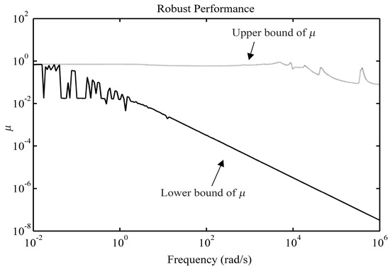 First, the robust stability analysis is given. It shows the controller ability to maintain system output stability on the condition of uncertain parameters variation. The upper and lower bounds of over a certain frequency range are shown in Figure 11.