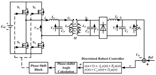 The output voltage Vo is compared with a reference voltage to produce error signal e. The discretized H∞ controller produces control output u based on the error signal e. The phase-shifted angle is calculated with u according to Equation (5).Then this angle is converted to the driving signal for the phase-shifted inverter.