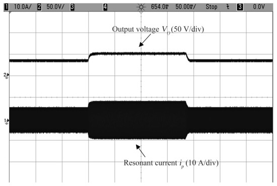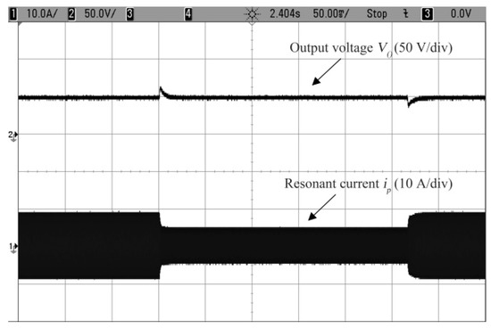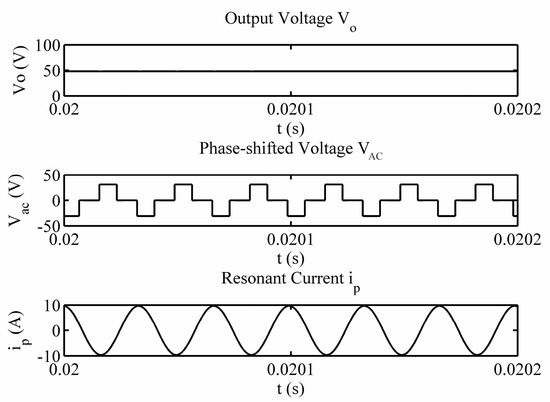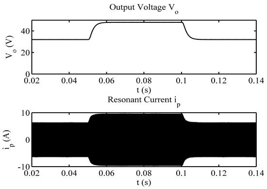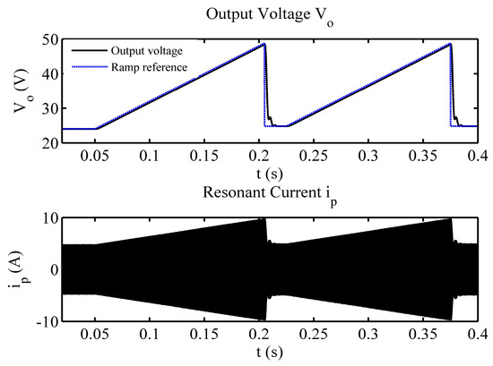 Figure 14 shows that the output voltage Vo was able to track the ramp reference signal rapidly while the resonant current ip changes from 4.8 A to 9.8 A. It denotes the controller has a good tracking ability for continuous varying reference. Secondly, the reference jump test was carried out to show the performance of the closed-loop system. The reference jumps was designed in the sequence of 32 V–48 V–32 V. The simulation result is shown in Figure 15.