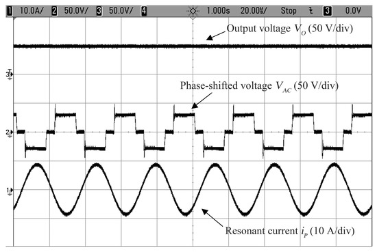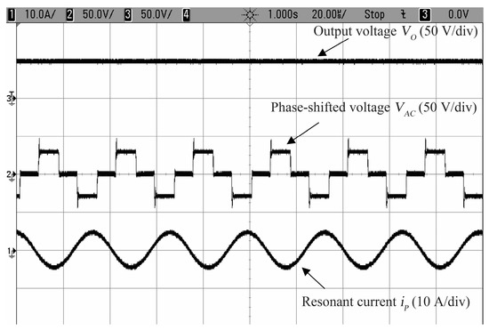 In Figure 17 and Figure 18, the zoomed waveforms of the output voltage Vo, phase-shifted voltage VAC, and resonant current iP in the steady state under different load conditions. Regardless of 50 Ω or 100 Ω load conditions, the output voltage Vo, the phase-shifted voltage VAC and the resonant current iP are stable and there is no ripple on the output voltage and phase-shifted voltage. Moreover, there is also no distortion on the resonant current. It shows that the controller also has a good performance in the system steady state.
