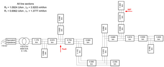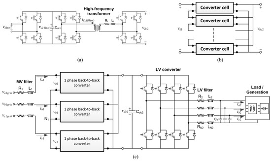 - The selection of the various parameters that have to be specified in the implemented SST model (i.e., controllers and filter parameters) was made following different approaches. In some cases, they were selected following the recommendations made by other authors. For instance, parameters of the input stage controllers were selected according to some rules provided in [24]. Other parameters, such as all those required for modelling the isolation stage and the LV-side output stage were basically those used in some previous papers by the authors; see [15,16,17]. Since the selection of some parameters was made without following any optimization procedure, a better selection remains as a future work. In any case it is worth mentioning the difficulties that are expected for some tasks. Consider, for instance, the selection of the PI controller values and filter parameters of the LV-side output converter. A flexible design of that converter should consider highly distorted LV currents due to the presence of nonlinear loads at the LV SST terminals. As with the ride-through capabilities discussed above, the present design of the output stage can cope with some harmonic distortion in the LV currents (see, for instance, simulation results presented in [15,16,17]), but above certain distortion level of the load currents the SST terminal voltage could be unacceptably distorted. A remaining task to solve these issues in the incorporation of harmonic compensation in the LV-side controllers.