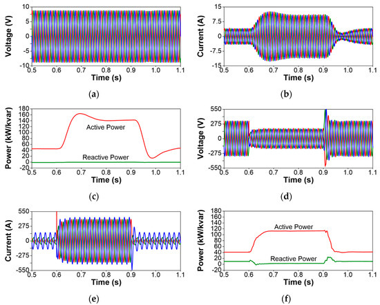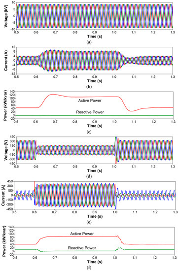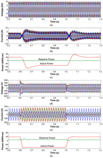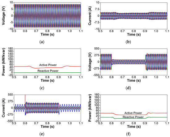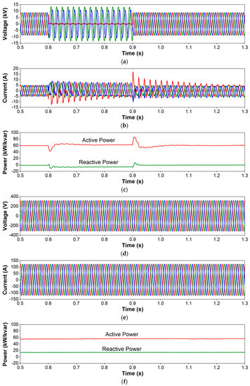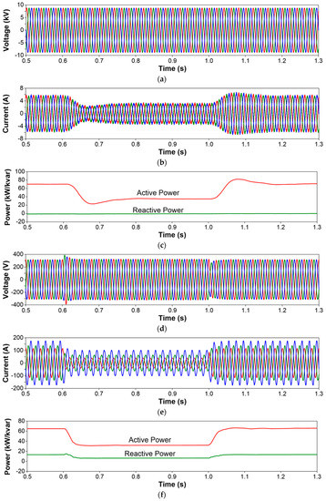 - Voltage sags and swells at MV terminals: Due to the grounding system selected for the test system, a single-phase-to-ground fault in the MV network (see fault location in Figure 6) will cause a voltage sag at the faulted phase MV terminals of the SST, and two voltage swells at the unfaulted phase terminals. The simulation results related to this case (see Figure 7) prove clearly that the voltage unbalance that occurs in the primary side of the SST is not propagated to the secondary side, where the phase voltages and currents remain constant and balanced. Note that the peak values of the currents during the fault condition are lower in the SST phases in which the fault causes swells and that the SST recovers current balance once the fault condition disappears.