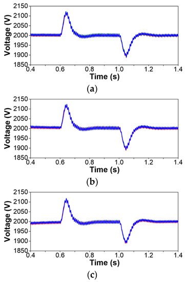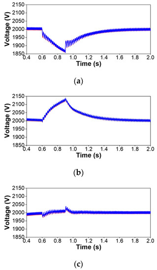 - An important aspect of the new SST design is the requirement of a controller that could guarantee a uniform distribution of voltages in the cells that form a single-phase section of the front-end MV multilevel converter. Since the cells of a single-phase section are connected in series at the grid side and in parallel at the load side, a voltage balancing strategy in the controller of the MV side multilevel converter is required. The performance of the strategy implemented in the present model has been tested by analyzing the voltages that results at the MV dc links during the steady and transient period of two test cases analyzed above, namely the voltage sag and swell caused by a short-circuit in the test system (see Figure 7) and the power flow reversal caused by an increase of the generation connected to the LV side of the SST (see Figure 9). The target of the control of MV dc links is to keep the voltage across each MV capacitor as close as possible to 2 kV. Figure 11 and Figure 12 show the voltages across some dc links of each phase for the two case studies mentioned above. Remember that there are 6 per phase. According to these results, the deviations in all dc links with the current SST design caused before and after the transient in each case study are smaller than 8% with respect to the targeted value. On the other hand, one can observe that the response is the same in all dc links of a given phase and very similar between phases in case of flow reversal; in the case shown in Figure 11 (i.e., a voltage sag in phase A and a voltage swell in phases B and C) the response depends on the phase. This supports the choice of the controller proposed in this work to balance dc voltages and keep them within acceptable margins.
