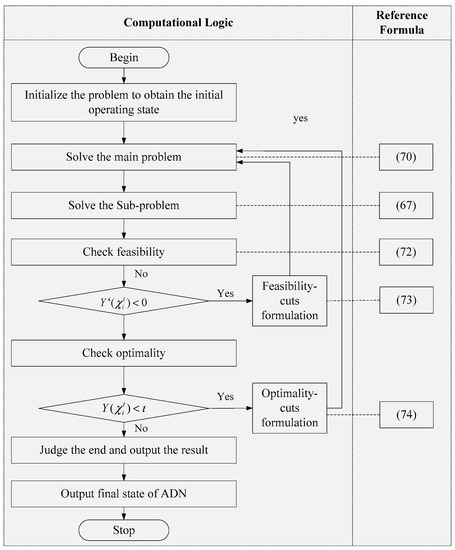 The Benders decomposition method will decompose the original optimization problem into several parts to be solved. By the process of iteration, the solution of reformulated problem will gradually approximate the optimal solution of the original problem. This method requires the separation of variables shown as and , both variables can be vectors. and are the functions for variable . is the coefficient matrix; , is the coefficient vector. is the feasible set for variable . Then the original problem (40) can be divided into two parts by Benders decomposition. Main problem is defined on the set , it can be linear, non-linear or discrete. The problem is formulated when , where is the solution of the sub-problem: