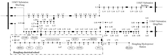 The demonstration application for active distribution network located in Guizhou, China. The strategy of stochastic optimal operation is verified based on the structure of the demonstration. The schematic diagram for the demonstration project is shown in Figure 2. The distributed generation and flexible load conditions are listed in Table 1. All electric vehicles support vehicle-to-grid (V2G) mode.