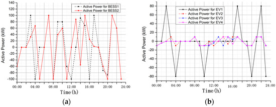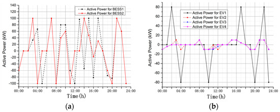 Optimization result for energy storage devices: (a) Active Power for BESS; (b) Active Power for EV.