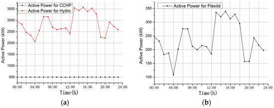Optimization result for power regulation devices in the second scenario: (a) Active Power for CCHP and Hydro; (b) Active Power for Flexild.