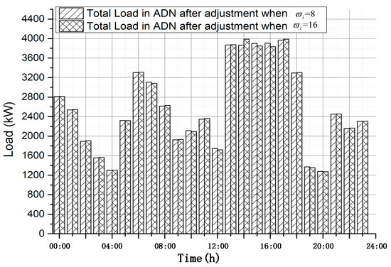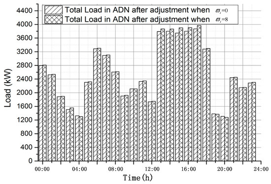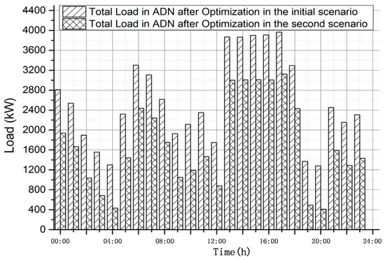 When the active power for all intermittent energy will be strictly the predicted value, which means there is no ‘worst scenario’ for the optimization equlation. Figure 9 shows the different optimization results in ADN when compared to the loads in ADN when . The peak-valley difference is reduced to 2561.18 kW when , which was better than .