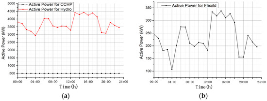 Optimization result for power regulation devices: (a) Active Power for CCHP and Hydro; (b) Active Power for Flexild.
