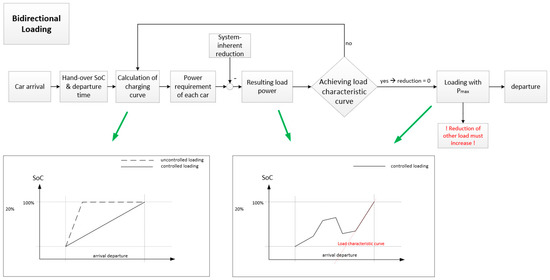 If an additional parameter for the minimum SoC (<100%) is set for the departure time by the user, it increases the degree of freedom for the timing of maximum power charging. However, a minimal residual SoC should be always guaranteed to allow unexpected trips and emergency driving. If the characteristic curve is reached, the load attenuation is ignored, and the car is loaded with maximum power. This additional power requirement must be provided by attenuation of all other loads (or some selected loads) in the system. If this is not possible for technical reasons, the car at the departure time cannot be fully charged.