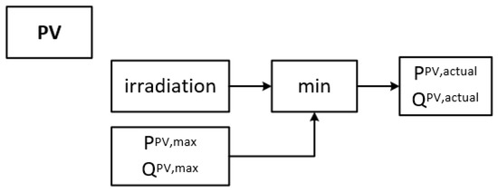 Within a microgrid, the PV infeed must be cut down by the control system if the supply exceeds the load and the available storage is fully charged. Furthermore, there may be an important power surplus if the PV system is oversized. Again, appropriate action must be taken in the course of the supply-dependent feed. To record the loss by depression of the PV output, a separate measuring device is required, recording the history of the irradiation. Such a measuring device can consist of one or more measuring cells that are locally installed close to the PV system. Evidence that a PV system can be simulated accurately by a simple measuring device is shown [19]. It was demonstrated that a PV system with various geographical orientations of panels can be mapped by a few cells with acceptable error. Figure 3 shows the flowchart of the PV-irradiation model in a microgrid. PPV,max and QPV,max represent the maximum possible feed, required at a given time point by the microgrid. Current infeed will have always a lower value (power generated from the current PV insolation or the maximum required power by the microgrid).