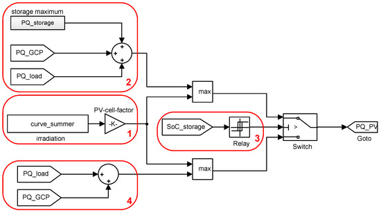 The following shows an example implementation of the PV supply system. Figure 4 shows a screenshot of the Simulink model. For clarity, the model is divided into four sections (red boxes). The following paragraphs correspond to the order according to the numbering of boxes.