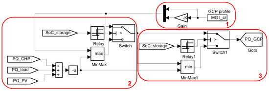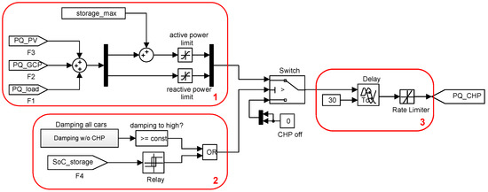 - A logical “OR” operator is used to decide under which conditions the mini-CHP is required. On the one hand, the mini-CHP is switched on when the storage level falls below a defined SoC (e.g., 10%). Then, the mini-CHP remains switched on until the storage reaches a second threshold value (e.g., 50%). On the other hand, the mini-CHP is used as support to charge the electric cars. When limiting the charging power per car (50% of the maximum power), the mini-CHP is also switched on until the load limitation of the load drops below this value.