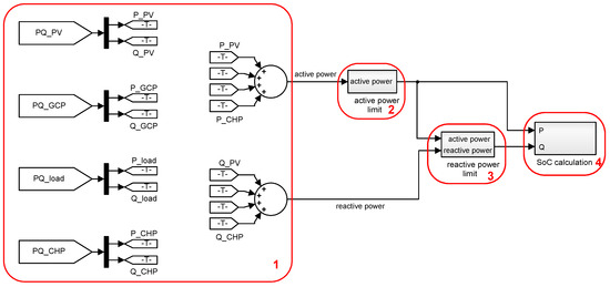 - In order to determine the active and reactive power required by the system, the real-time power values of the active components are added. Only real power is to be made available to the storage from the mini-CHP. The minimum (=0), as well as the maximum (>0) are limited for the active power by means of a “saturation” block. The maximum can be set by a variable during the initialization, which was defined in the workspace. As a result, the power of the mini-CHP can be easily adapted during optimization. The reactive power has independent limits of the real power, so a separate “saturation block” is necessary.