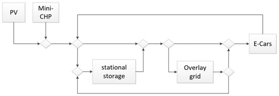 Figure 11 shows the energy flow of a sample plant where a PV plant and a mini-CHP are used as feeders, a stationary battery as energy storage, electric cars currently shown exclusively as a controllable load and to be eventually considered later as bidirectional units, as well as a superimposed medium voltage network.