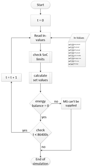 A possible sequence of the simulation of a microgrid is shown in Figure 12. Here, a 24-h simulation is described as an example with a one-second simulation step. At the beginning of the simulation (starting at time t = 0), the initial values of all components of the model are read. The initial values include the states (for example, the mini-CHP is in standby, the charge state of the storage, the number of the controllable loads, etc.), as well as the values for the active and reactive power. These values can then be used to check whether all limit values are complied with.