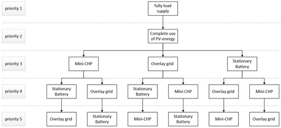 Using a priority tree, the variety of possibilities for prioritization can be demonstrated. A priority tree with five components [16] shows 120 options for the priority order of the components. Taking into account the unconditional load supply and the subsequent use of all available PV energy, the reasonable possibilities are reduced to six, which are shown in a tree structure in Figure 13. The control system in a complex system, such as a microgrid model, can either be defined by one of the components themselves or implemented separately by a superimposed controller.