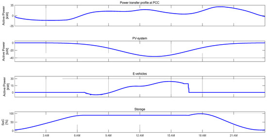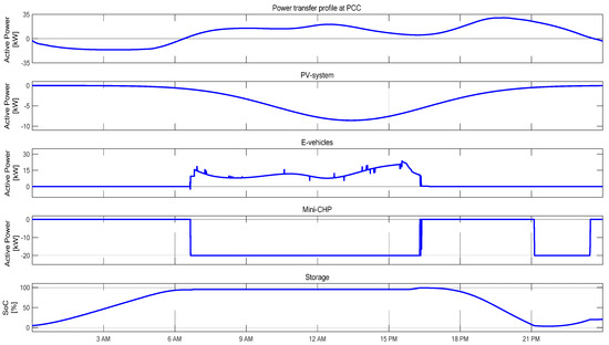 In order to find a suitable starting point for the optimization, the energy balance within the microgrid is considered over a whole day. For this purpose, the required daily energy quantity of the cars (111 kWh) and the daily energy amount at the GCP (180 kWh) are added with correct signs. The amount of energy required must be provided by the PV system and the mini-CHP unit. Neglecting the mini-CHP, the above-described PV system has an installed power of 74 kW for an average summer day. This configuration makes it possible to determine the storage capacity of 100 kWh and a storage power of 26 kW. Figure 14 shows the real-time load profiles of the GCP, the PV system and the electric cars in kW, as well as the percentage of consumption in the load for the defined component dimensioning.