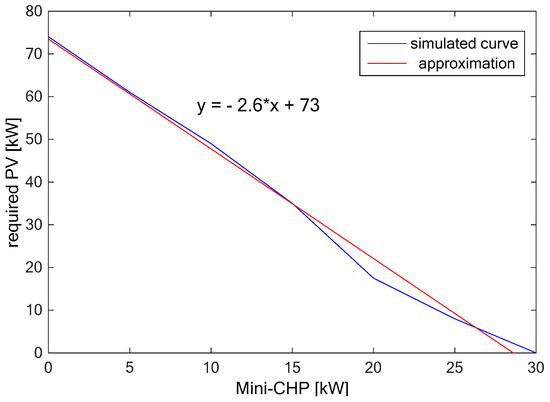 Table 1 shows the results of the optimization for the component storage and PV as a function of the selected mini-CHP power parameter. As can be clearly seen, there is almost no relation between the mini-CHP and the storage in the example shown. The storage dimensioning takes place predominantly on the basis of the predefined load profile at the GCP, specifically due to the uptake of energy from the superimposed network into the microgrid before the electric cars are connected. There is, however, a clear relation between the required PV power and the dimensioning of the mini-CHP. If the required PV power is plotted above the installed mini-CHP power, a straight line can be approximated by a simple curve fitting, which is given by the function .