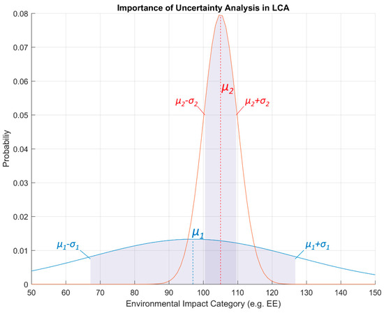 The fundamental role of uncertainty analysis in LCAs is easily understood by looking at Figure 1. The figure shows a mock example where the embodied energy (EE) of two alternatives, 1 and 2, are being compared. Most LCAs only provide deterministic, single-valued results which generally represent the most likely values resulting from the specific life cycle inventory (LCI) being considered. These values can be seen as μ1 and μ2 in the figure. If a decision were to be taken only based on such numbers one should conclude that alternative 1 is preferable over alternative 2 since μ1 is lower than μ2. This, unfortunately, is often the case in most existing literature in LCAs of buildings.