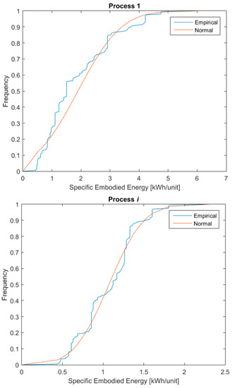 In order to perform a Monte Carlo analysis, an input domain is required from which xi variables can be randomly picked according to a given probability distribution. For each j sub-process, two sets of continuous input domains are derived in here from the discrete data collection P. Namely: a vector N containing n pairs of values μj and σj, representing respectively the mean and standard deviation of xi values of embodied energy associated with the jth sub-process.