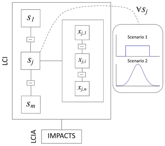 The primary data collection represented a time-consuming and costly activity. Therefore, the research team wondered whether it was possible to infer information on the uncertainty of the result of the LCA as well as its probability distribution without embarking onto such an extensive data collection. To do so, the empirical case of collected primary data characterised by a normal distribution has been used as a reference. This was then compared with a less demanding approach to determine variability in the data. The simplest alternative is generally the use of a maximum–minimum variation range, whereby the only known piece of information is that a value is likely to vary within that range. The likelihood of different values within that range remains, however, unknown. From a probabilistic point of view, the closest case to this maximum–minimum scenario is that of a uniform distribution, which is characterised by a defined data variation range within which all values have the same probability. The comparison between these two alternatives, and their influence on the uncertainty of the result of the LCA, was the underpinning idea for this research. This has been tested through the algorithm developed and explained in detail in the next section.