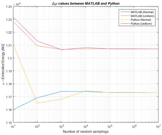 Therefore, to combine the benefits of a lighter data collection with the benefit of an uncertainty analysis, the algorithmic approach developed for this research has tested whether and to what extent the knowledge of a data distribution within a known data variation range influences the outcome of an uncertainty analysis undertaken through Monte Carlo simulation. The algorithmic approach has been developed, implemented and tested in MATLAB R2015b (8.6.0). Once initial results were obtained, the robustness of the findings has been further tested for validity by one of the co-authors who independently implemented an algorithm in Python with the aim of addressing the same research problem. Findings were therefore confirmed across the two programming languages with different algorithms written by two of the authors to strengthen the reliability of our results. A comparison of the results produced in MATLAB and Python 3.5 is shown in Figure 4 and Figure 5 for the mean values µ and the standard deviations σ respectively.