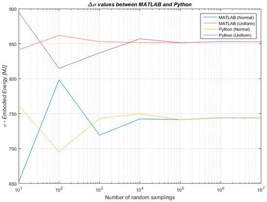 Difference between results produced in MATLAB and Python for the standard deviation values of embodied energy of the life cycle inventory (LCI).