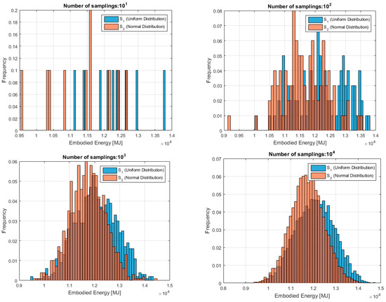 The research presented in this article has addressed current challenges in uncertainty analysis in LCA of buildings. By means of an innovative approach based on Monte Carlo simulation, it has tested the influence of two different assumptions on data distribution towards the final results of the uncertainty analysis. The different assumptions on the data sets tested in this research were (1) data with a normal distribution and (2) data with a uniform distribution, both based on primary data collected as part of a robust dataset. Results have demonstrated that after 104 random samplings from within the data variation range, the initial assumption on whether the data were normally or uniformly distributed loses relevance, both in terms of mean values and standard deviations.
