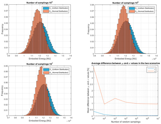 The histograms refer to the LCIA (overall impact) and not to the LCI (individual inputs). All seven sampling cases are shown, from 101 to 107 random samplings. The figures show that for lower numbers of samplings the characteristics of the two distributions are still evident whereas from 104 random samples upwards the results of the two methods converge. The algorithm calculates also the difference between the mean values and standard deviations and normalises them to a percentage. This information is presented in the last (bottom-right) graph of Figure 6. It can be seen how the difference between μ and σ under the two hypotheses is not influential anymore after 103–104 samplings. If for the mean this could be expected as a consequence of the central limit theorem, this finding is noteworthy for the standard deviation.