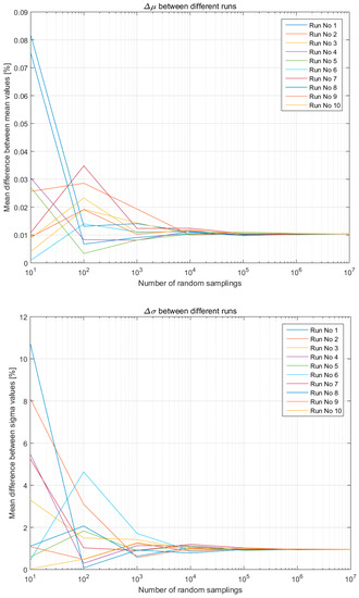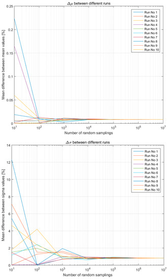 Figure 7 shows the μ and σ variation (percentage) between the two hypotheses across all 10 runs in the case of a simplistic LCI composed of two entries. In all runs, regardless of the initial difference for lower number of samplings, after 105 random samplings the average differences stabilise around: